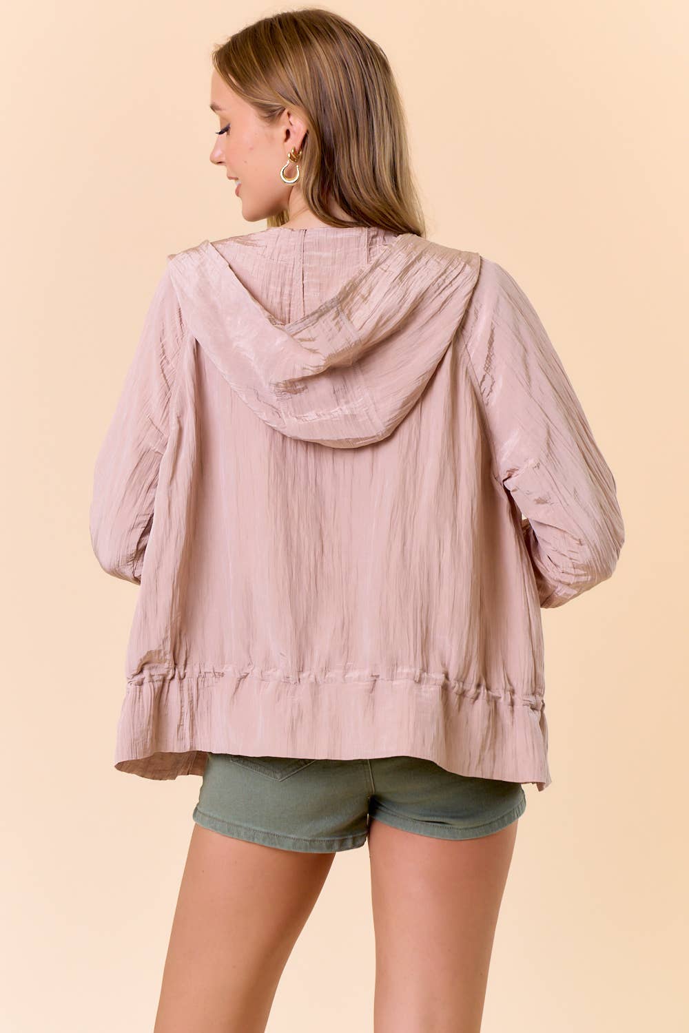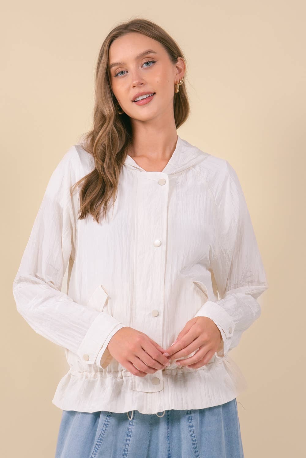DRAWCORD WAIST CRINKLED HOODIE WINDBREAKER W/ FRONT FLAP POCKETS
